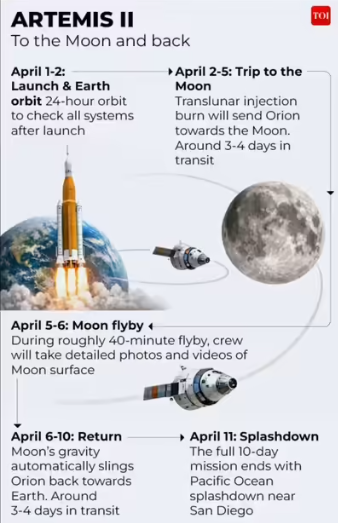 - NASA is preparing for Artemis II, the first crewed mission to the Moon’s vicinity since Apollo 17 in 1972. The mission will send four astronauts on a ~10-day lunar flyby (no landing), testing the Orion spacecraft and Space Launch System (SLS) in deep space.