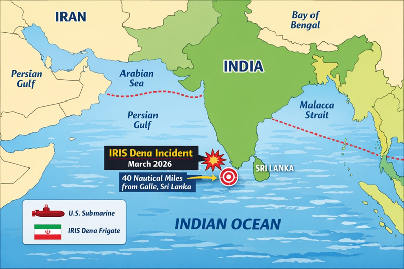 - The sinking of the Iranian naval frigate IRIS Dena by a United States submarine near Sri Lanka in March 2026 has placed India in a particularly sensitive diplomatic situation. The incident gained further significance because the Iranian warship had recently participated in an international naval exercise hosted by India, highlighting India’s close engagement with multiple countries in the Indian Ocean Region. The sudden escalation of tensions involving two countries with which India maintains important relations has created a complex strategic and diplomatic environment.